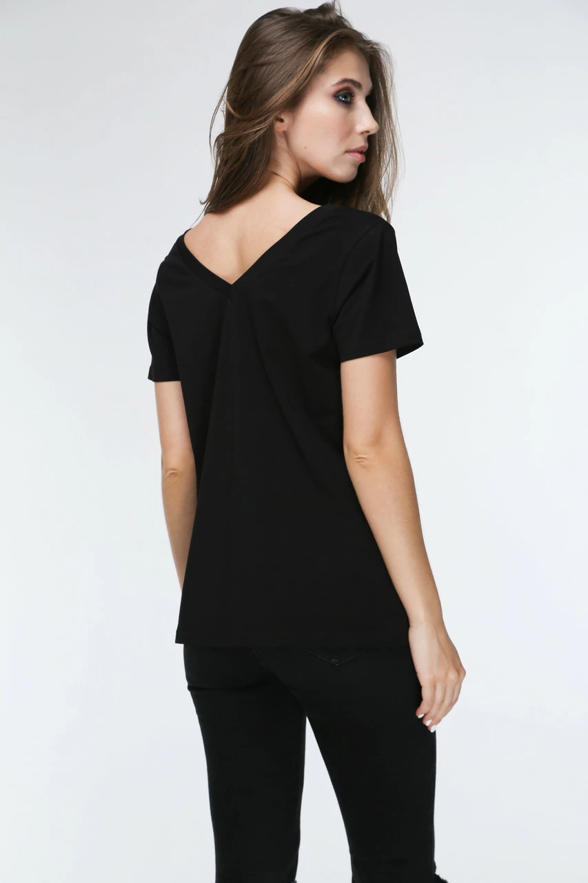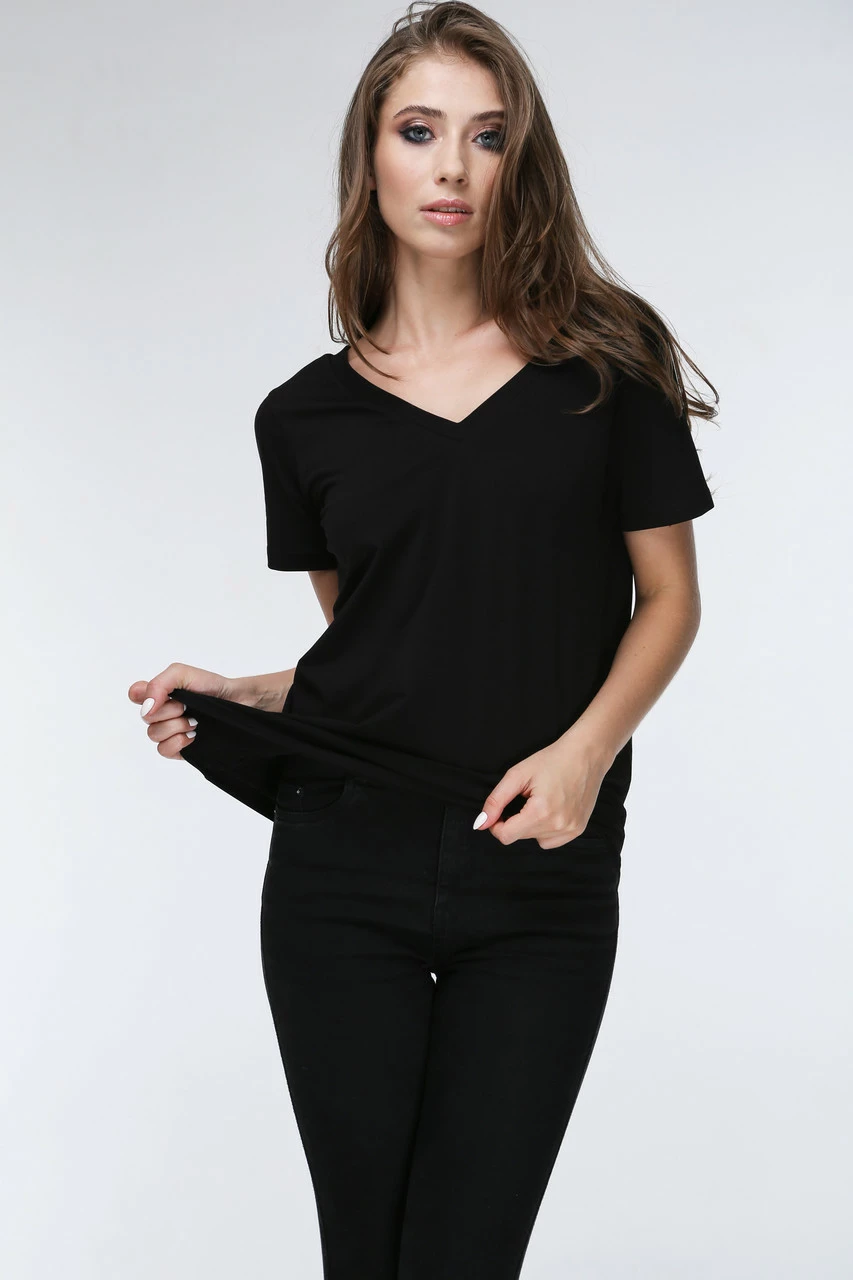 Хлопковая футболка полу приталенного силуэта с v-образным вырезом по переду и по спинке изделия. Очень удобная и практичная.