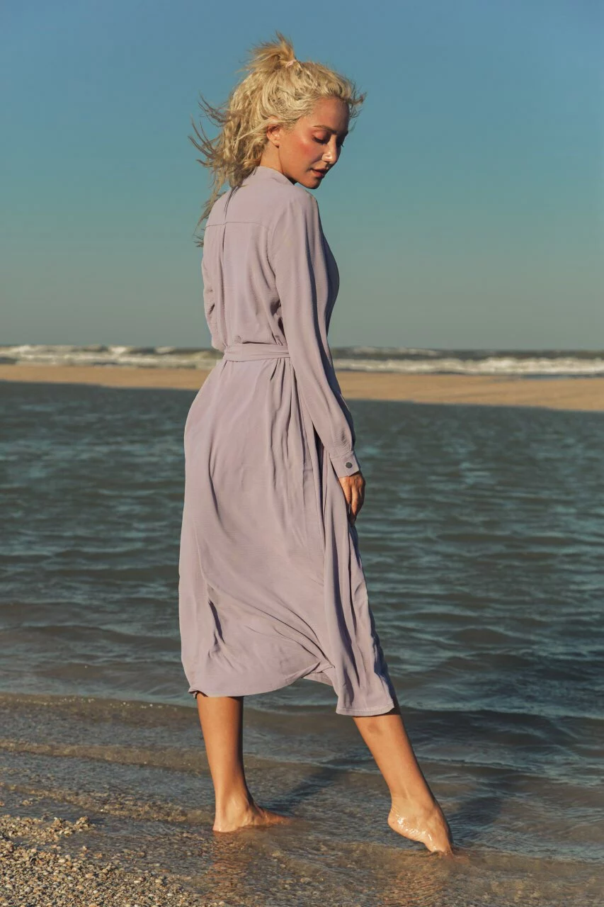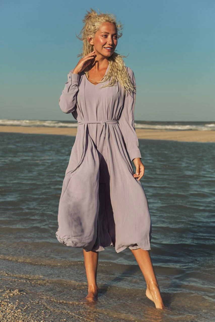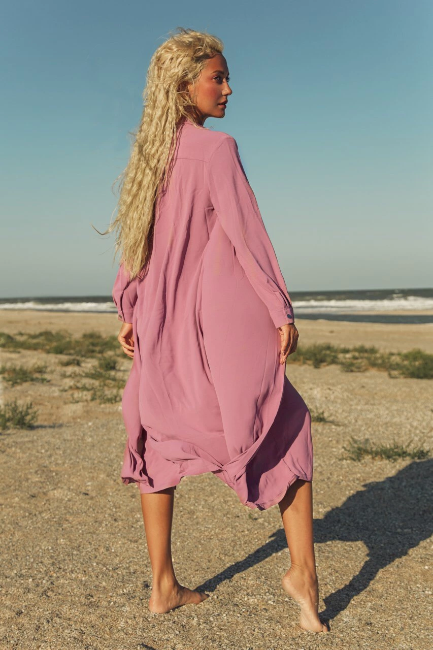 Оригинальное женское платье-кардиган свободного силуэта ниже колена выполнено из легкой струящейся ткани. Однотонное женское платье с длинным рукавом имеет V-образный вырез горловины. Красивое платье-кардиган - для повседневной жизни и стильных деловых луков, позволяющие выглядеть женственно и элегантно даже в будничные дни, на работе и просто на прогулке.