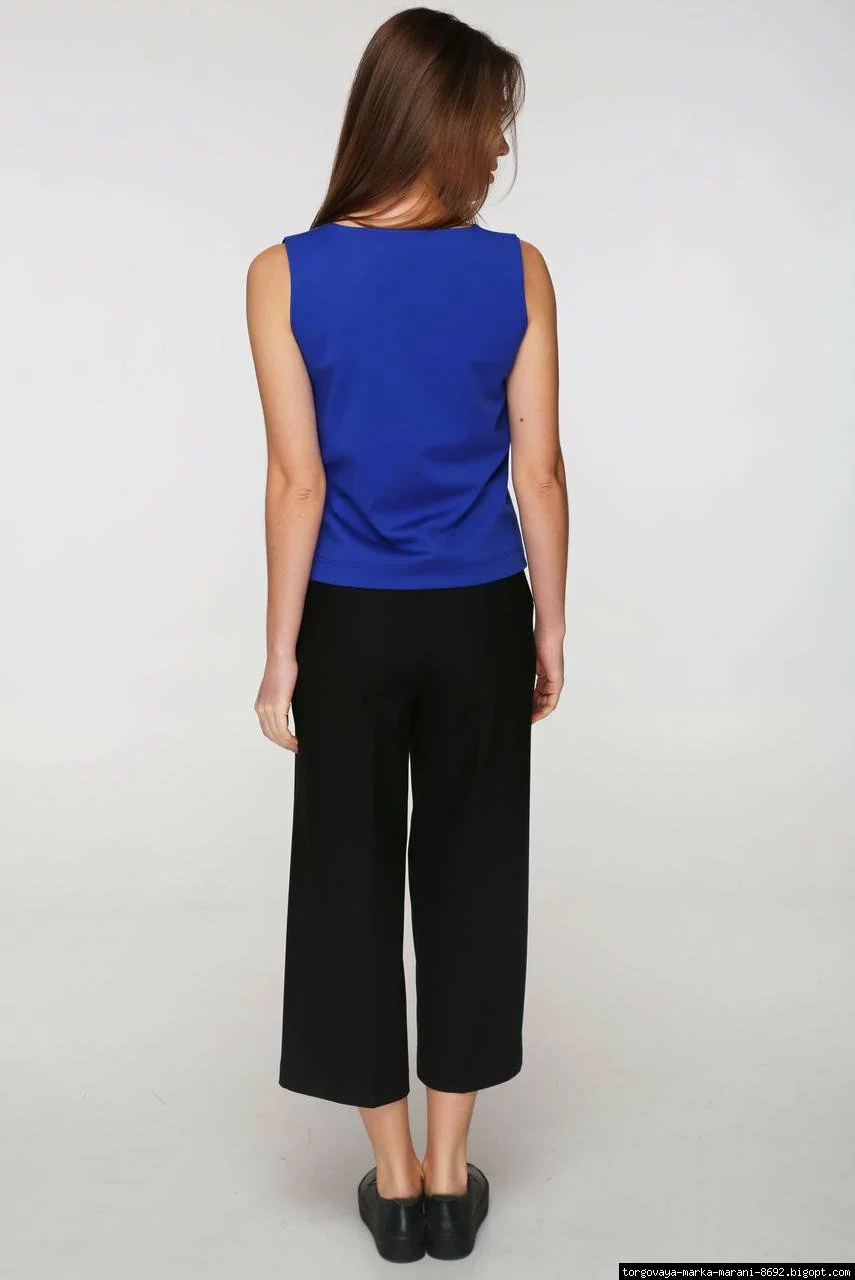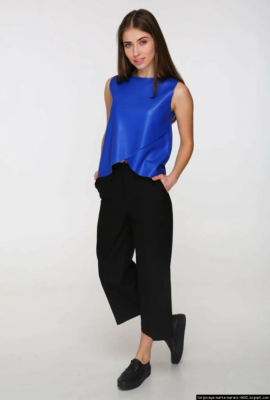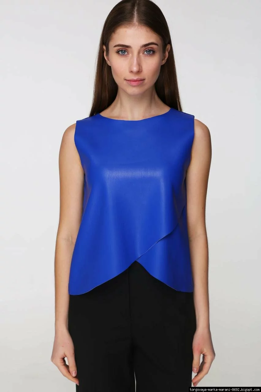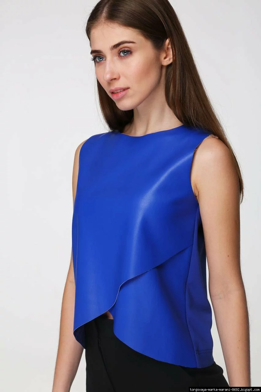 Перед тобой геометричный топ из эко-кожи без рукавов. Спина изделия